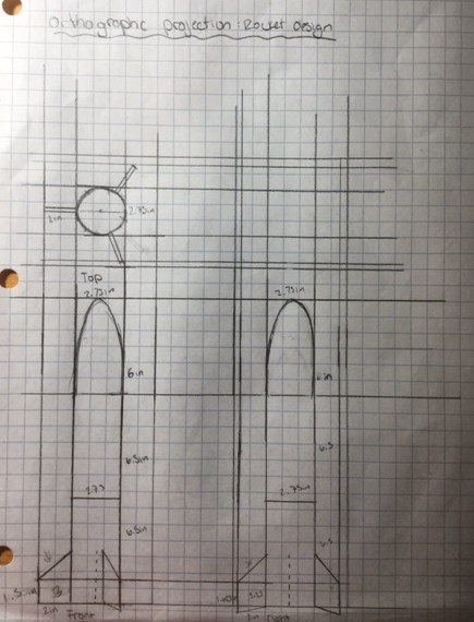 Below is our final 2D orthographic model (for both the rocket and egg contraption), which we will show in order give you correct dimensions for our model rocket.